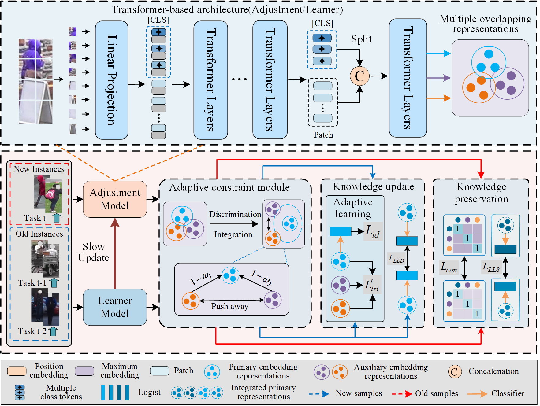近日,中國科學(xué)院沈陽自動化研究所機(jī)器人學(xué)研究室機(jī)器智能研究組科研團(tuán)隊提出了一種多樣化表征嵌入框架,可有效地提升模型的抗遺忘和自適應(yīng)學(xué)習(xí)能力。該框架采用基于Transformer的主干網(wǎng)絡(luò),通過最大化嵌入和多重類別令牌技術(shù),為每個實(shí)例生成多個表征。為了提升模型的表征能力,科研團(tuán)隊設(shè)計了自適應(yīng)約束模塊,通過對多個表征執(zhí)行整合和判別操作,確保特征多樣性的同時消除冗余信息??蒲袌F(tuán)隊還提出了知識更新和知識保護(hù)策略,強(qiáng)化模型對新信息適應(yīng)能力的同時保護(hù)歷史知識。在大規(guī)模數(shù)據(jù)集、遮擋場景等11個數(shù)據(jù)集上,驗證了所提方法的有效性。