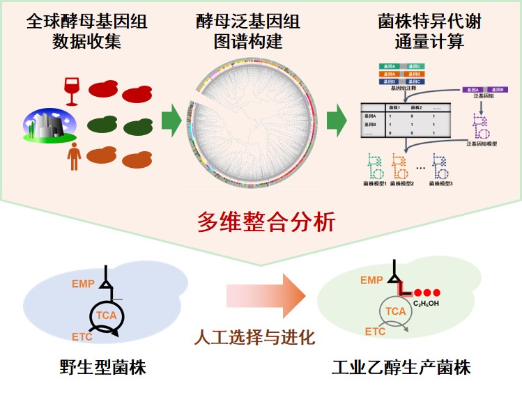 本研究創(chuàng)建了高質(zhì)量酵母泛基因組與菌株特異性代謝模型數(shù)字資源庫?;诖?,團隊建立了“泛基因組-代謝模型-多組學整合”的多維度分析流程,為從系統(tǒng)層面理解微生物的環(huán)境適應性及代謝特性提供了新理論框架。以工業(yè)乙醇生產(chǎn)菌株為例,團隊從基因、轉(zhuǎn)錄及代謝通量三個維度證實,強化糖酵解下游途徑與乙醇的高效合成密切相關,該發(fā)現(xiàn)為后續(xù)乙醇及其衍生物細胞工廠的理性設計提供了重要線索。