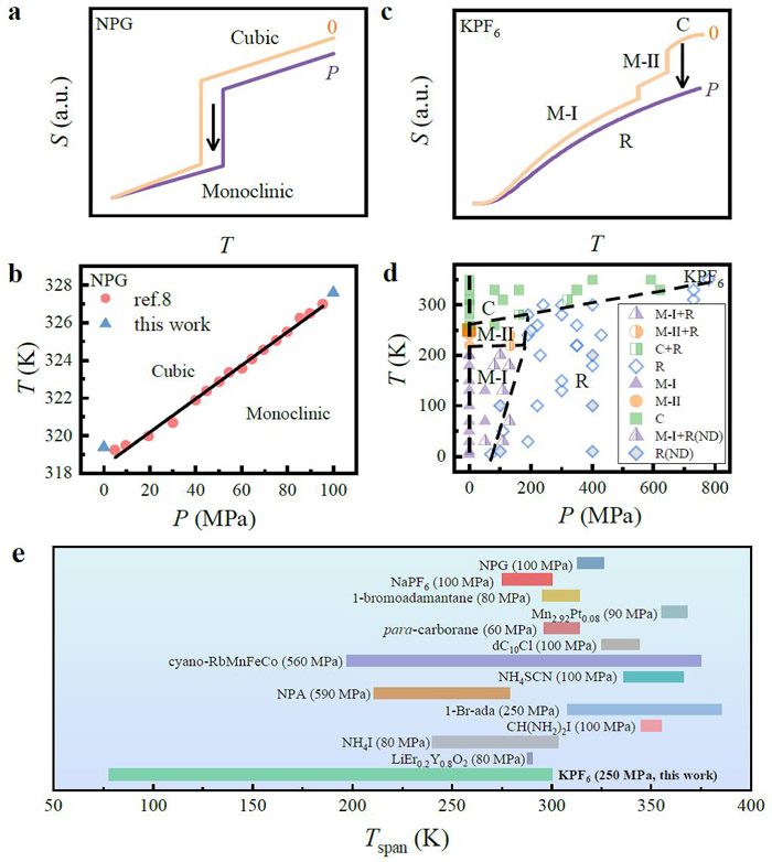 KPF6在室溫為面心立方相,PF6八面體呈現(xiàn)了各向同性的隨機(jī)旋轉(zhuǎn);隨著溫度降低,分別在257 K轉(zhuǎn)變?yōu)閱涡毕郔I,隨后在219 K轉(zhuǎn)變?yōu)閱涡毕郔。前期研究表明,在室溫附近施加壓力產(chǎn)生高壓菱方相從而導(dǎo)致了龐壓卡效應(yīng)(Mater. Horiz. 10,977 (2023)),調(diào)控材料顆粒尺寸可在低場下獲得較大的可逆壓卡熵變(Appl. Phys. Lett. 126,081904 (2025))。在此次研究中,利用自研的壓卡效應(yīng)絕熱溫變測量裝置,直接測量了KPF6在室溫至液氮溫區(qū)絕熱溫度變化:250M Pa壓力下,室溫為12 K,77.5 K為2.5 K。綜合運(yùn)用實(shí)驗(yàn)室原位高壓拉曼散射譜儀和日本J-PARC的高壓中子衍射譜儀,獲得了上百個(gè)溫度-壓力組合條件下的結(jié)構(gòu)信息,繪制了完整的高壓相圖,第一性原理計(jì)算復(fù)現(xiàn)了高壓相變特征。