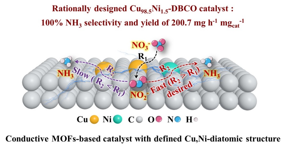 近日,大連化物所太陽能研究部太陽能制儲氫材料與催化研究組(DNL1621組)章福祥研究員團隊聯(lián)合計算和數(shù)據(jù)驅(qū)動催化研究組(511組)肖建平研究員團隊,在雙原子電催化劑(DACs)的理性設(shè)計與構(gòu)筑方面取得新進展。研究團隊基于具有優(yōu)異導(dǎo)電性和水穩(wěn)定性的金屬有機框架材料(conductive MOF,cMOF),通過對銅-鎳(Cu-Ni)雙原子活性中心的精準(zhǔn)調(diào)控,實現(xiàn)了在工業(yè)級電流密度下接近100%選擇性地高效合成氨,并揭示了硝酸根電還原合成氨過程中的協(xié)同“接力催化”機制。
