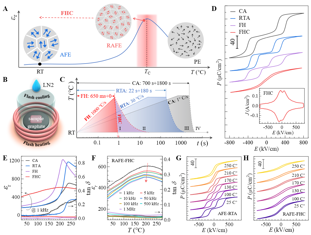 針對(duì)上述挑戰(zhàn),中國(guó)科學(xué)院金屬研究所沈陽材料科學(xué)國(guó)家研究中心胡衛(wèi)進(jìn)研究員團(tuán)隊(duì)創(chuàng)新性地提出利用超快結(jié)晶過程 “鎖定” 高溫納米鐵電/反鐵電疇,以制備高性能弛豫鐵電或反鐵電薄膜的新思路。研究團(tuán)隊(duì)據(jù)此成功開發(fā)出升降溫速率達(dá)每秒1000 ℃的“閃速退火”工藝,并憑借它,僅用1秒就完成了鋯酸鉛 (PbZrO3) 弛豫反鐵電薄膜的結(jié)晶 。相關(guān)薄膜電容器展現(xiàn)出了良好的儲(chǔ)能性能和出色的熱穩(wěn)定性。該成果以“閃速退火構(gòu)筑晶圓級(jí)弛豫反鐵電薄膜以提升儲(chǔ)能性能 (Flash annealing-engineered wafer-scale relaxor antiferroelectrics for enhanced energy storage performance) ”為題, 于2025年11月15日發(fā)表在 《科學(xué)進(jìn)展》(Science Advances)雜志上。